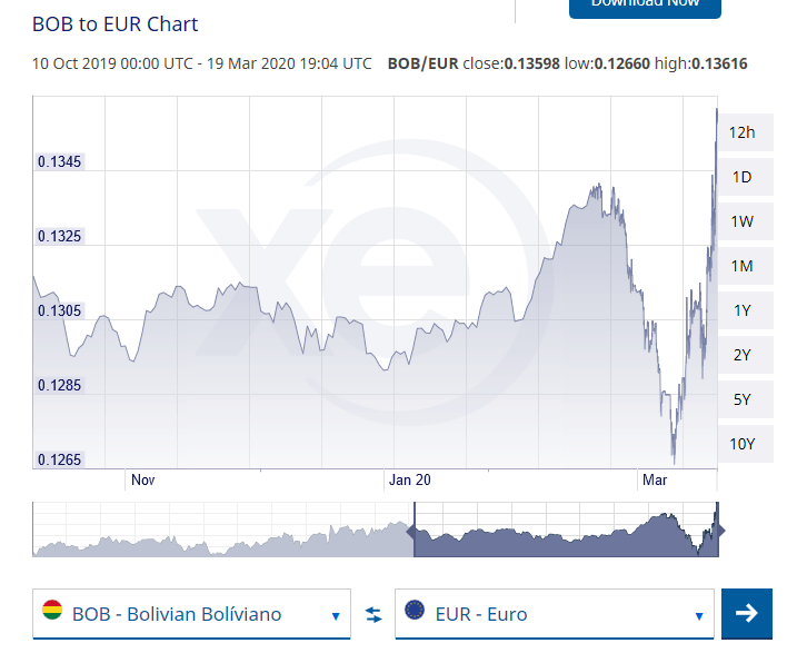 Om mijn aanname te controleren ben ik valutakoersen gaan checken en inderdaad, de Roebel is spotgoedkoop. Rusland is nog niet geïnfecteerd en dus kun je nu (NU!) keiveel roebels kopen met je peperdure euro’s. Nog interessanter: als het paniekvirus nieuwe landen en hun valuta infecteert veert de waarde van de munt terug. De valutakoersen maken zo een vrij steile V-vorm. Hieronder zie je de waarde van de Boliviano ten opzichte van de Euro, totdat de Bolivianen doorkrijgen dat zij ook allemaal doodgaan (9 maart 2020) en dan schiet de waarde van de Boliviano weer op. Eerder was er dezelfde V tussen de Yen en de Dollar. Wie nu heel snel geld wil verdienen moet dus kijken welke valuta nog niet geïnfecteerd is en op tijd in- en uitstappen.
