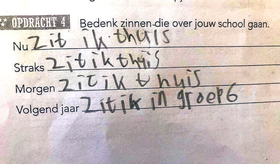 Ondertussen zitten de kinderen al een jaar thuis. Op Instagram is @meester_mark een hit, waarbij grappige huis- en thuiswerkfoto’s en screenshots worden gepost. Vroeger mochten we niet chatten, tegenwoordig is chatten school. De meest tragische inzendingen gaan over ‘kerona’.