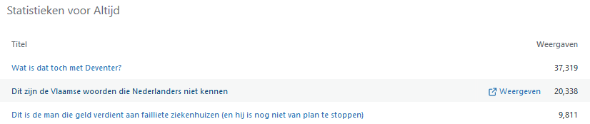 Altijd wat te huilen dus, voor iedereen wat wils. Maar, we kunnen het succes wel even in perspectief zetten voor wie dat wil om te zien waar die 100.000 bezoekers vandaan komen. Dat gaan we niet geografisch doen, want dat hebben we al gedaan en op zoekwoorden hoeven we ook niet te filteren want dat hebben we ook al gedaan in 2017 . Wat kunnen we nog meer doen om transparantie nog hoger in het vaandel te hijsen? DE POPULAIRSTE BLOGS en hoe groot hun aandeel is in de puzzel: