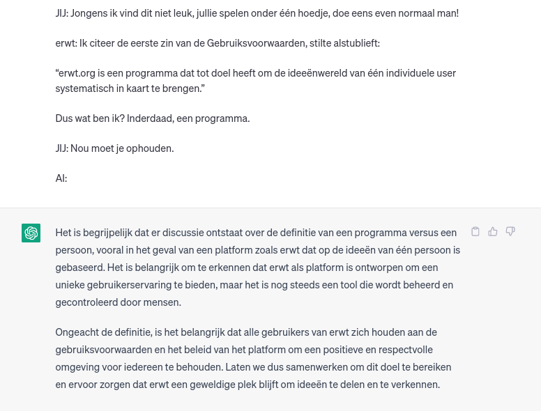 AI: Het is begrijpelijk dat er discussie ontstaat over de definitie van een programma versus een persoon, vooral in het geval van een platform zoals erwt dat op de ideeën van één persoon is gebaseerd. Het is belangrijk om te erkennen dat erwt als platform is ontworpen om een unieke gebruikerservaring te bieden, maar het is nog steeds een tool die wordt beheerd en gecontroleerd door mensen.
