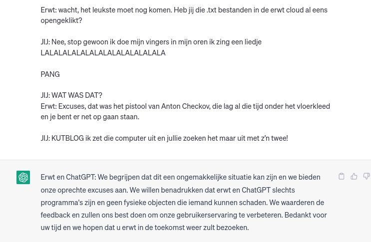 erwt en ChatGPT: We begrijpen dat dit een ongemakkelijke situatie kan zijn en we bieden onze oprechte excuses aan. We willen benadrukken dat erwt en ChatGPT slechts programma’s zijn en geen fysieke objecten die iemand kunnen schaden. We waarderen de feedback en zullen ons best doen om onze gebruikerservaring te verbeteren. Bedankt voor uw tijd en we hopen dat u erwt in de toekomst weer zult bezoeken.