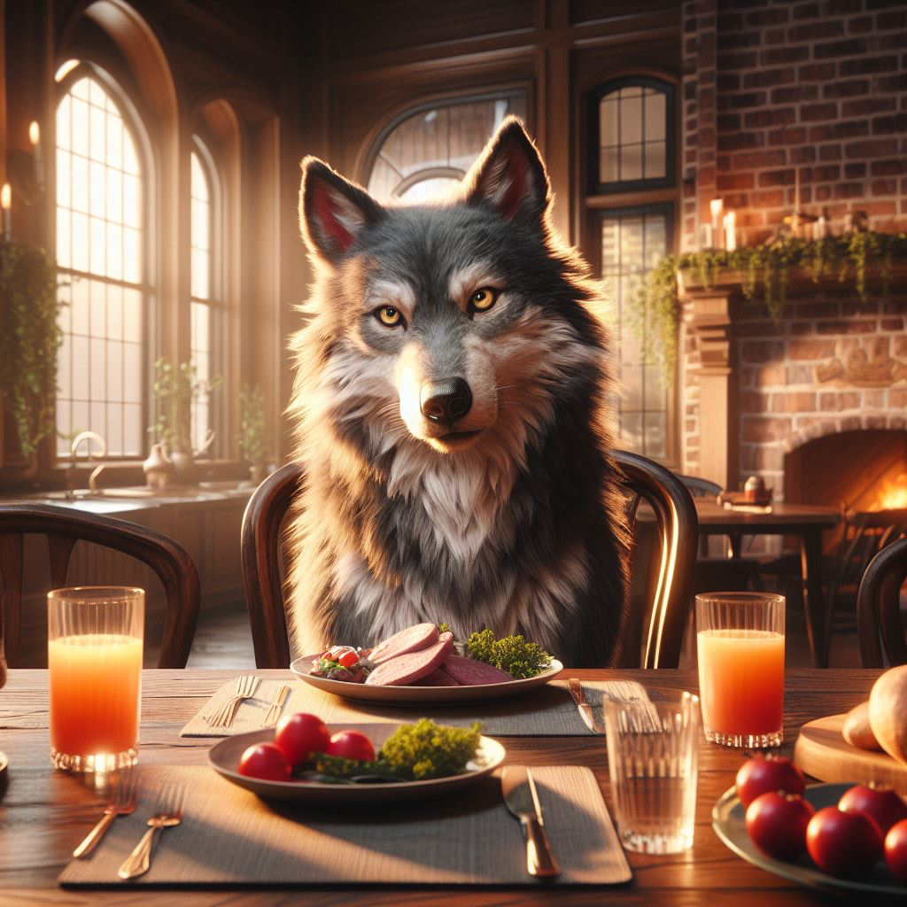 We passen ons een beetje aan aan de wolf. Eet de wolf een schaap? Geen probleem, we hebben er toch genoeg. Komt de wolf in het park? Geen probleem, hij hoort daar thuis, wij niet. Mag de wolf op restaurant? … Wat een stomme vraag is dat zeg, de wolf is een wild dier, die lust alleen maar rauw vlees en die heeft niets te zoeken in een restaurant. Aha, maar dat is de vraag niet. De vraag is: Mag de wolf op restaurant?