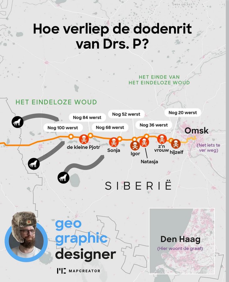 Oke, geografie, design, duidelijk. Maar wat wil de Geographic Designer ons vertellen? Aha, daarvoor moet je een insider zijn. Als je hem ziet, dan zie je hem. Omsk…wolven…de kleine Pjotr… nu zou er bij de gemiddelde, modale Nederlander een lichtje moeten branden: De dodenrit van Drs. P! Wie kent het niet? Cultureel erfgoed. Het is een cabaretliedje dat gaat over een gezin dat in een Trojka (iedereen kent het woord alleen van het nummer) door de sneeuw naar Omsk (idem) glijdt door het Eindeloze Woud, waar geen leeuw te bespeuren valt. Leeuwen niet nee! Maar wolven zeker wel, wat onvoordelig uit kan pakken voor een jong gezin…